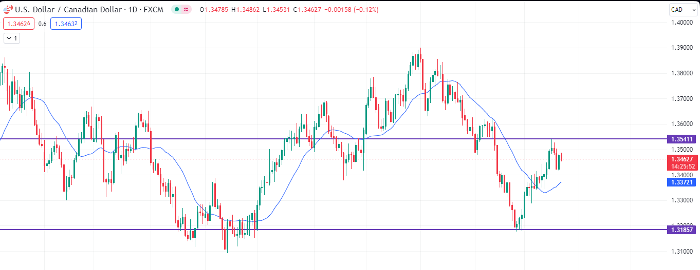 USD/CAD is trading above the 20-day MA. On the downside, the pair has support at 1.33721. A fall below that level can bring the pair towards 1.33000.